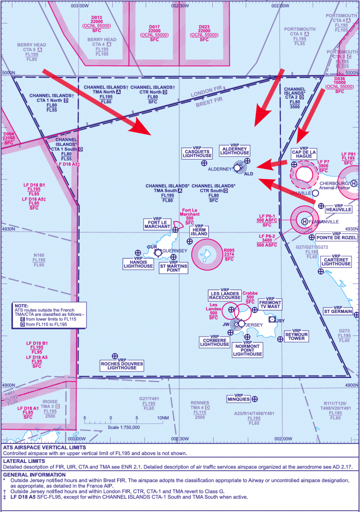 Please take care to remain clear of or below the airway Q41 (Base FL55) north of ORTAC, CI CTA-2 (Base 3500ft) and avoid the Cap De la Hague restricted areas!
